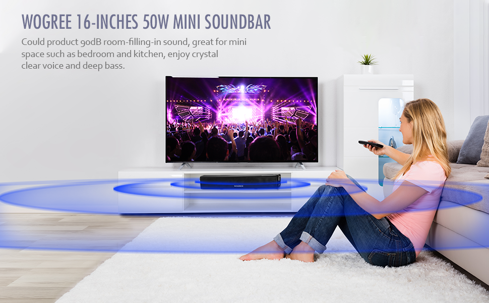 Wogree Mini Soundbar 16-Inch 50W with Bluetooth, Optical, AUX, USB Connection, Small Sound Bar Speakers System for TVs, Home Theater, Gaming, Projectors, PCs, Tablets, Phones