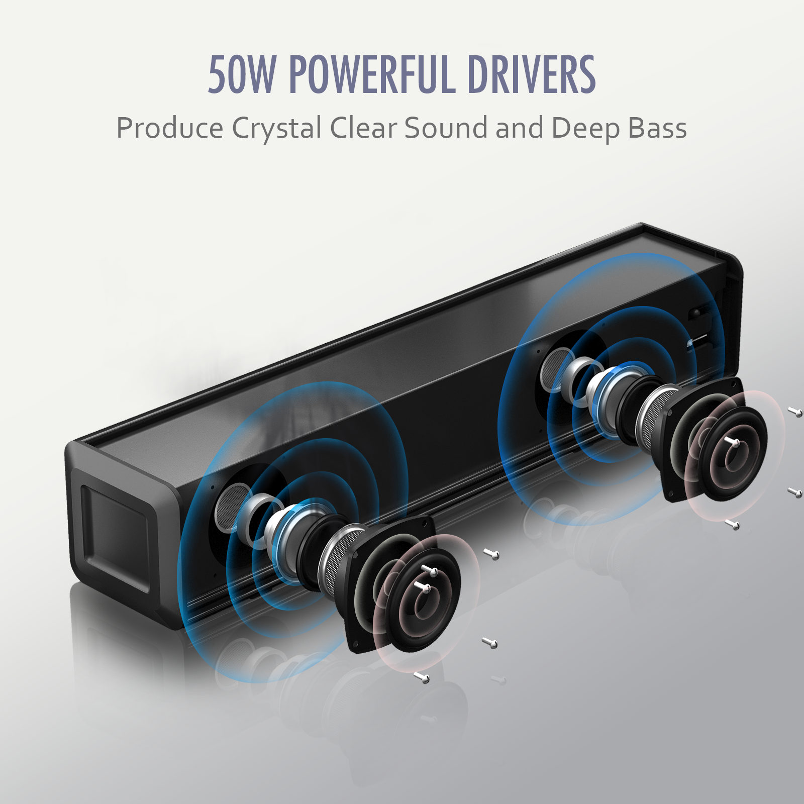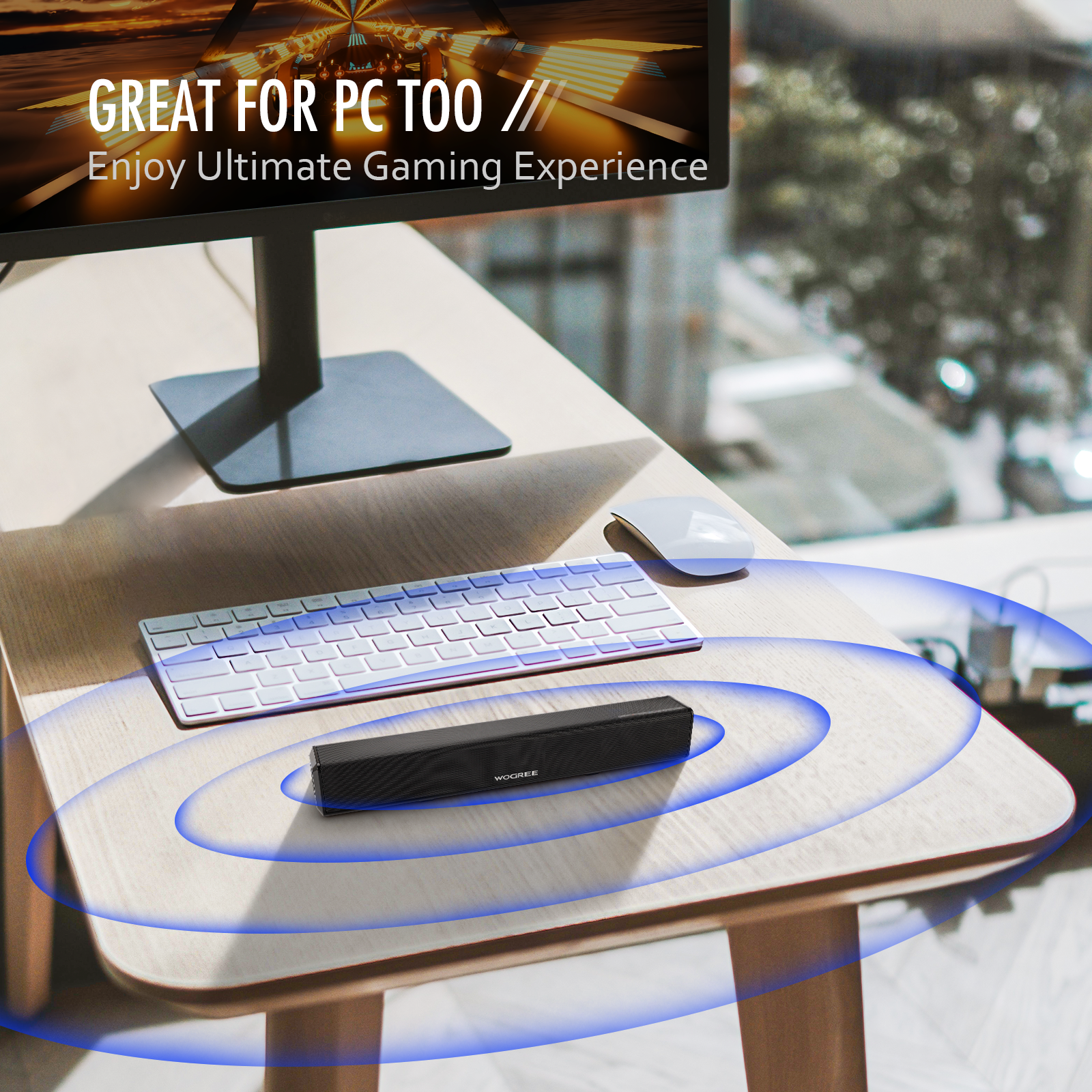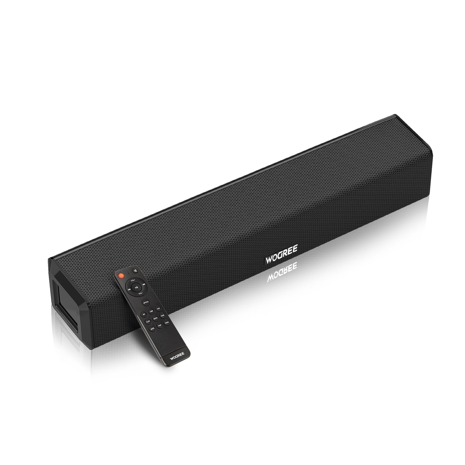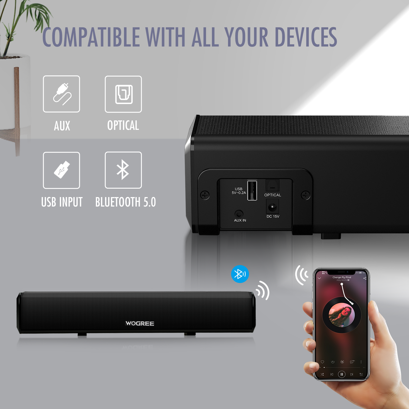 Wogree 2.0 channel wireless Bluetooth home theater soundbar S66,16-inch 50watts with 2x full-range speakers and 1 bass reflex tubes, output up to 90db of expansive audio and crystal-clear sound, support Bluetooth 5.0, optical, USB, AUX inputs, compatible with almost all your devices including TVs, tablets, PCs, Phones, PS4, and projector, etc.
